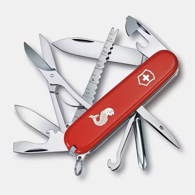 Cuando escuches hablar de la Navaja Suiza, es probable que venga a tu mente el recuerdo de la legendaria navaja para oficiales. Esa leyenda sigue viva con la navaja de bolsillo Fisherman. Se diseñó y fabricó teniendo en cuenta las necesidades de los pescadores y, por supuesto, incluye un descamador de pescados y un saca anzuelos. Guárdala en tu caja de aparejos y siempre estarás listo para tu próxima gran pesca.